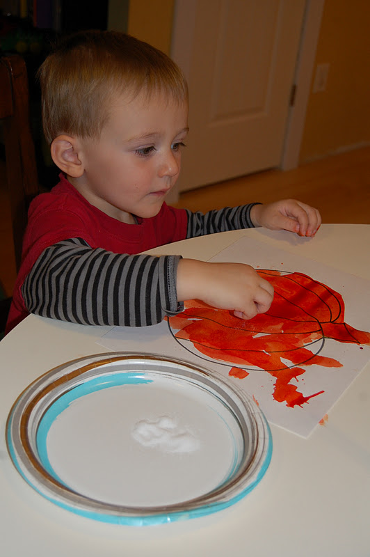 First we drew our pumpkins in a black Sharpie marker and then using liquid water colors she blended primary colors to get our two secondary colors of orange and a greenish/brown color. Then we proceeded to paint the pictures fairly quickly to ensure they were still pretty wet. Once painted sprinkle a fair amount of salt over the painting. Within minutes you could see changes happening - as the painting is drying the salt soaks up the color of the paint, leaving a unique blotching effect. Once the painting is dry, scrape of the salt by lightly rubbing the painting over the sink. You can see the salt is now the color of your painting... kind of cool!